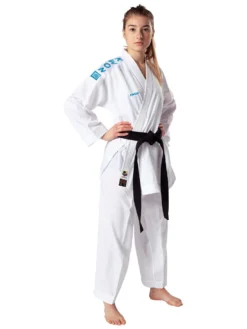 Idealer Kampfsportanzug für junge Martial Arts Kids. Die Jacke mit Klettverschluss am farbigen Revers lässt sich einfach überziehen. Die Hose sitzt dank dem elastischen Schnürbund. Die Enden der Ärmel und Hosenbeine sind farbig. Das DRACHENKRALLE Logo an der Jacke und am Gürtel ist ein Hingucker. Die Rückseite bietet Platz für eine individuelle Bedruckung. So macht das Kindertraining Spaß!