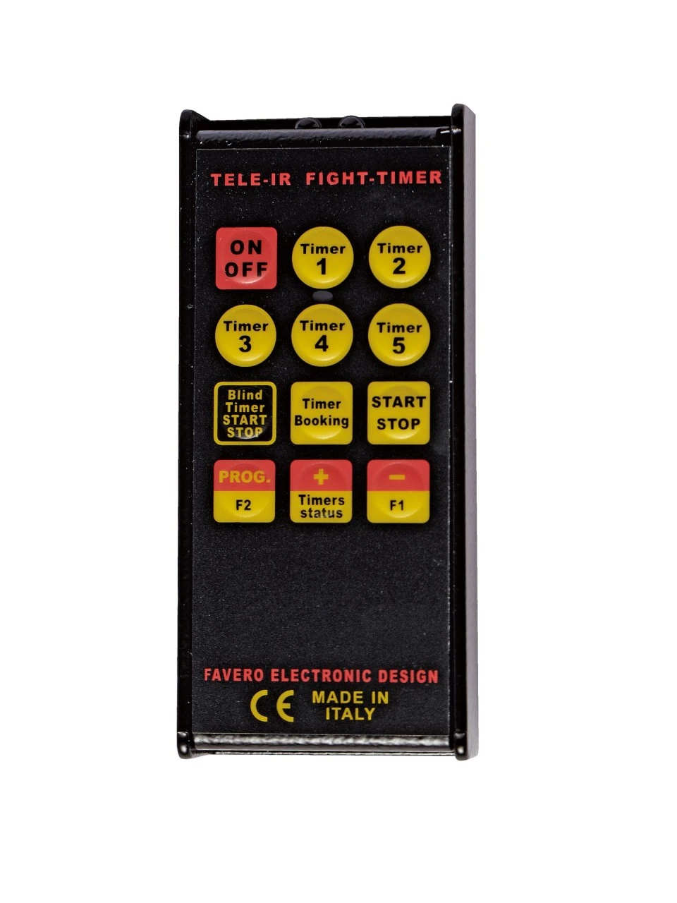 Mit Infrarotstrahlen für Fight Timer (Nr. 331504005). Reichweite: 15 m. Versorgung: mit Alkali-Batterie 9 Volt. Betriebsautonomie: etwa 140.000 Arbeitsgänge! Robuster Aluminiumbehälter mit eingeschränkten Abmessungen: 14,5 x 5,5 x 2,2 cm. Membrantastatur, kann nicht durch Schmutz oder Flüssigkeiten beschädigt werden.