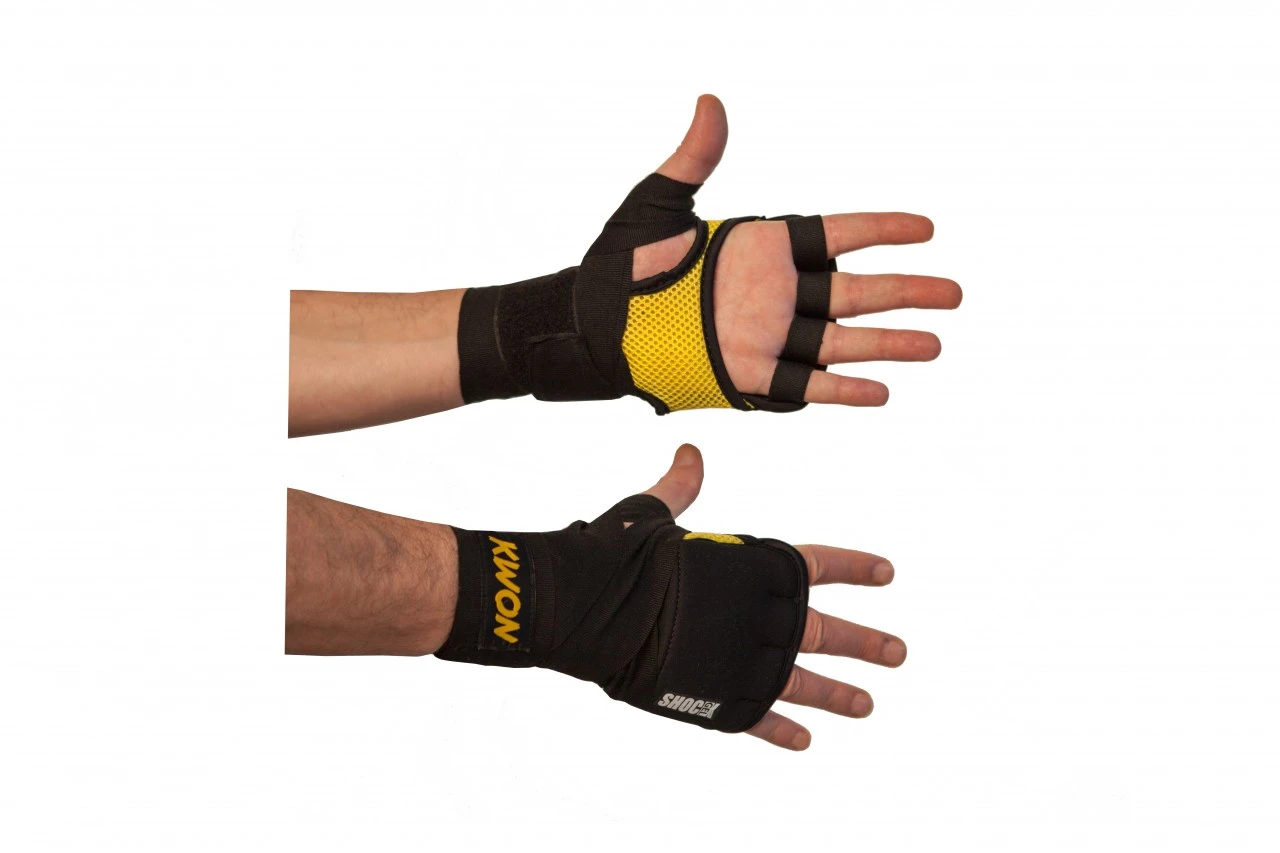 - Einfach in den Innenhandschuh hinein schlüpfen und die integrierte 2,5 m lange Stretch-Bandage um das Handgelenk wickeln und zum Schluss mit dem Klettband fixieren.