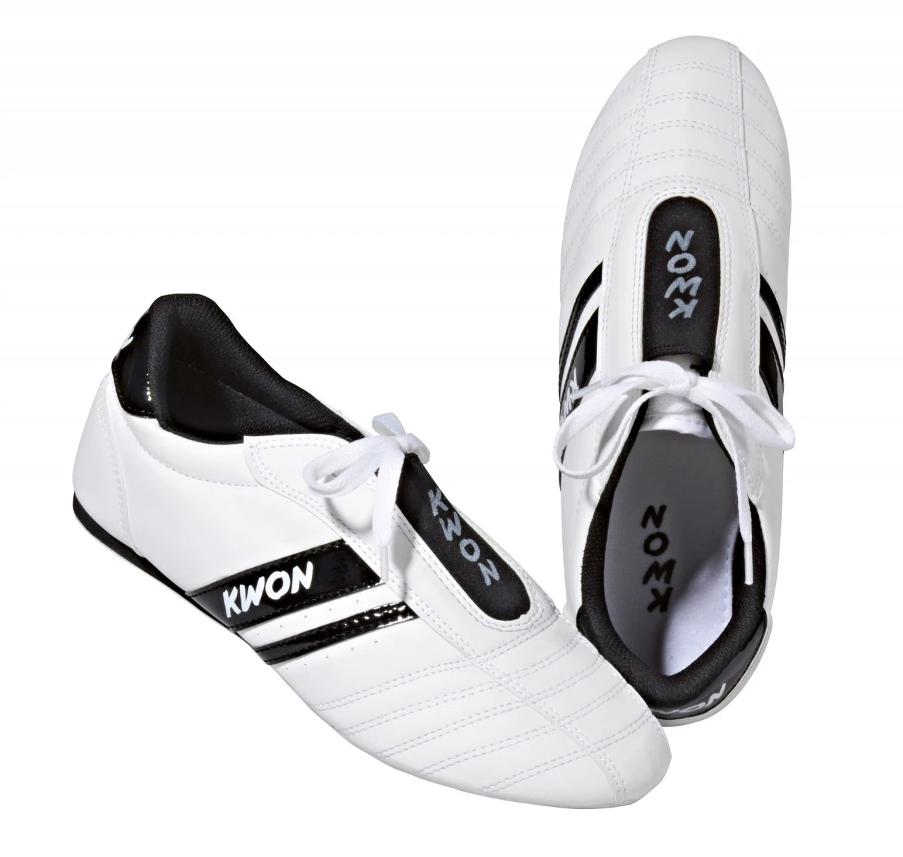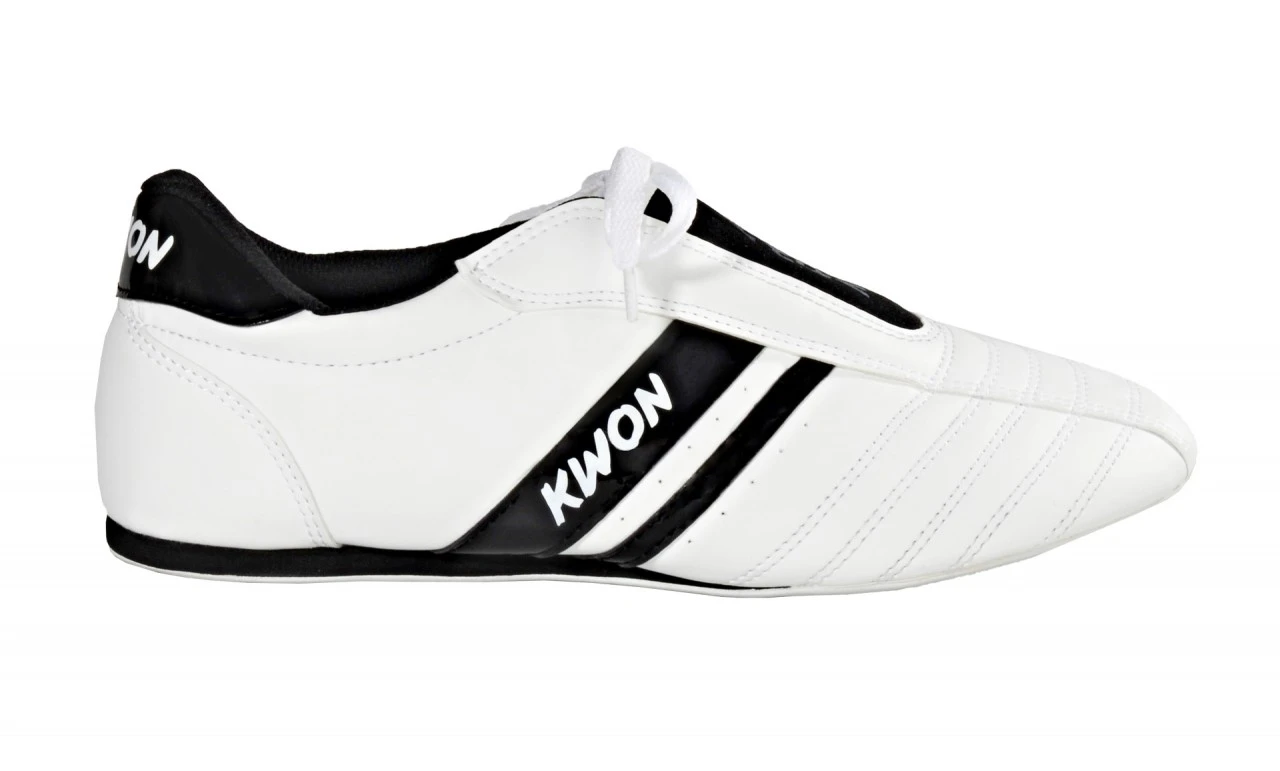 Der Schuh hat eine dünne, elastische Gummisohle, sowie eine hochgezogene Ferse und doppelt verriegelte Nähte. Ventilationslöcher seitlich sorgen für Belüftung. KWON Logo-Druck auf Seitenstreifen und Spann.