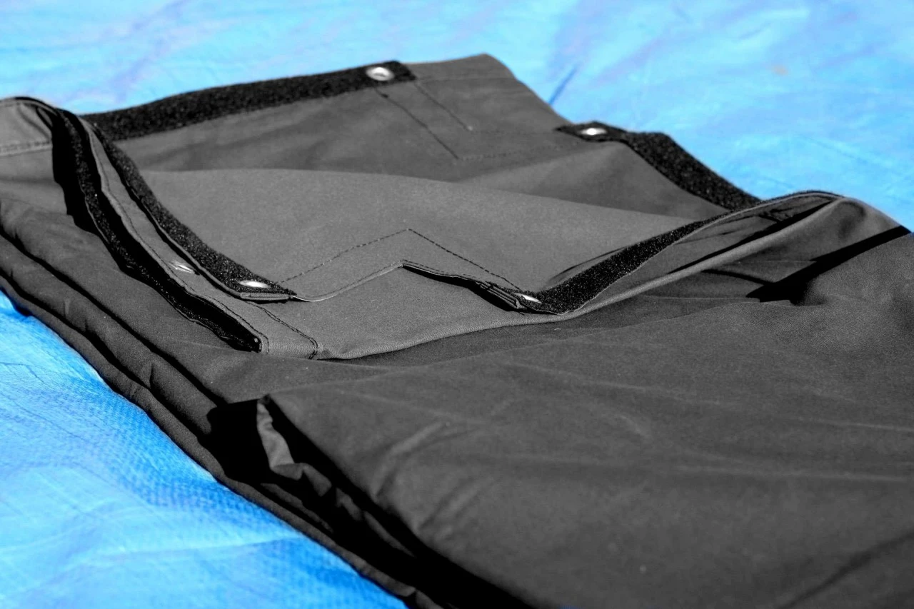 Rutschfeste Profi-Ringplane aus schwarzem Segeltuch ca. 600 g/qm, gesäumt und geöst, mit Klettband für Seitenteile.