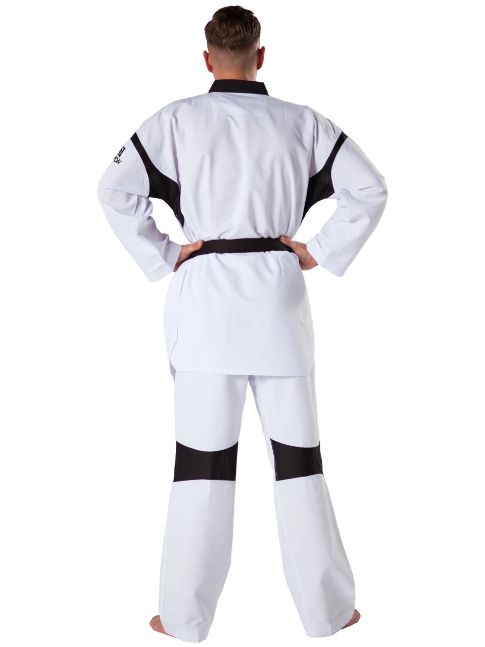 Der hochwertige Dobok mit schwarzen Mesh-Einsätzen an Oberteil und Hose ist von der World Taekwondo (WT) offiziell als Wettkampf-Anzug zugelassen.